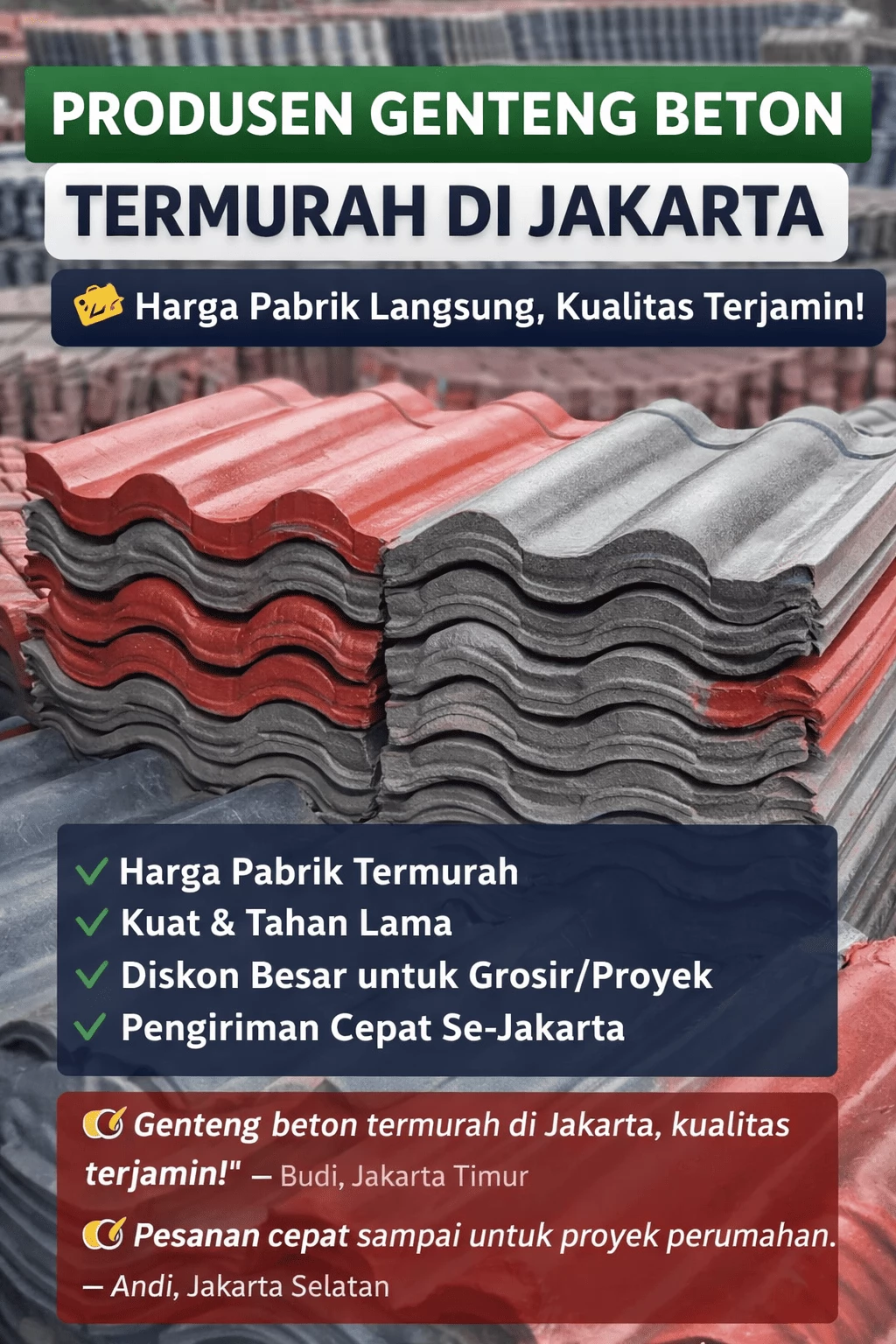 Sedang mencari produsen genteng beton termurah di Jakarta dengan kualitas kuat dan tahan lama? Anda berada di tempat yang tepat. Kami adalah pabrik genteng beton terpercaya di Jakarta yang melayani pembelian langsung tanpa perantara, sehingga harga jauh lebih hemat dan kualitas tetap terkontrol.